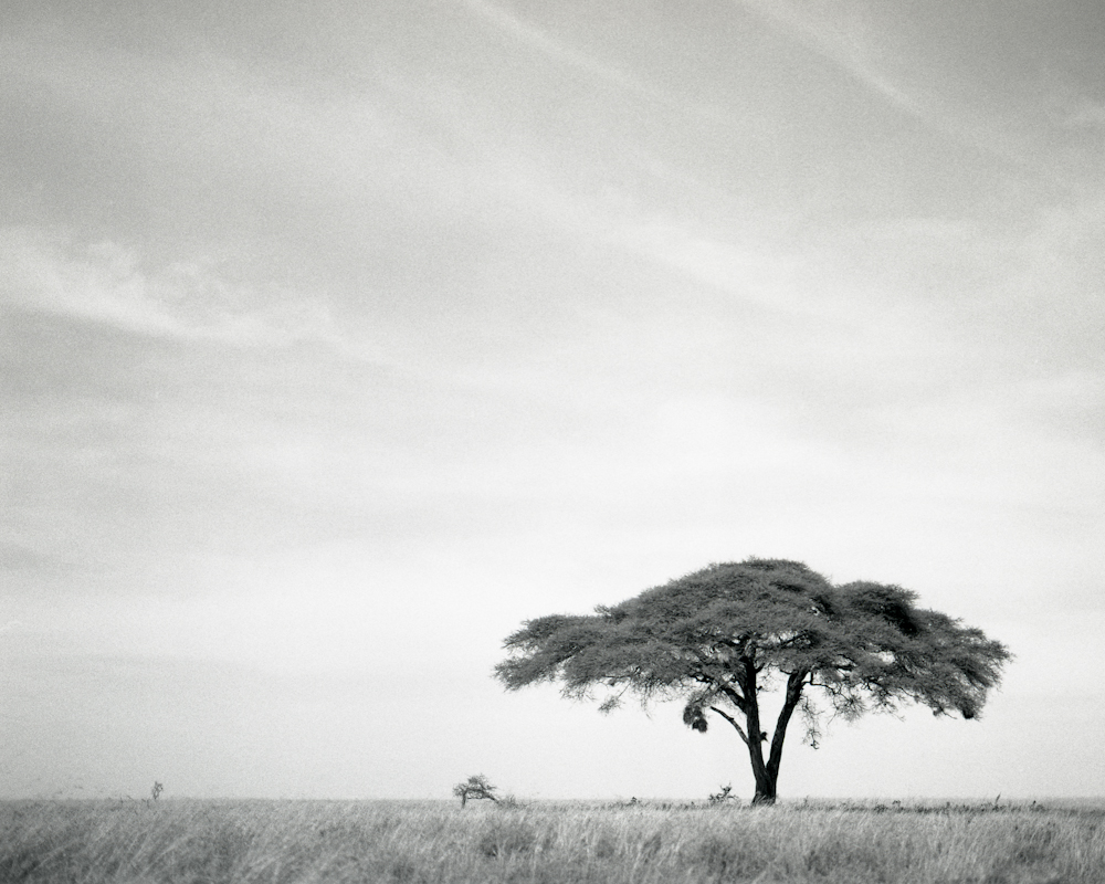 Eenzame boom op de eindeloze vlakten Oplage: 3 stuks Afdruk op dibond achter acryl glas - z/w foto. Achter de foto zit een aluminium u-profiel om het werk op te hangen.
