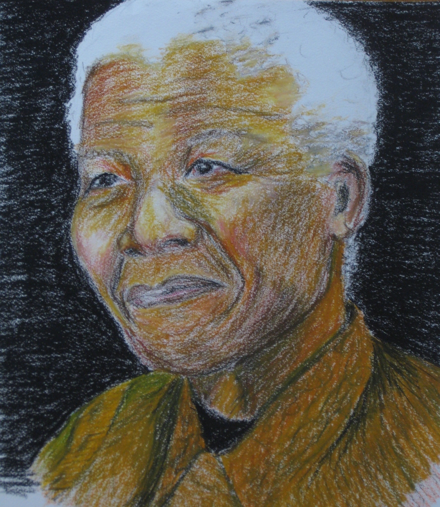 Mandela in oliekrijt op papier, als opdracht voor een workshop.