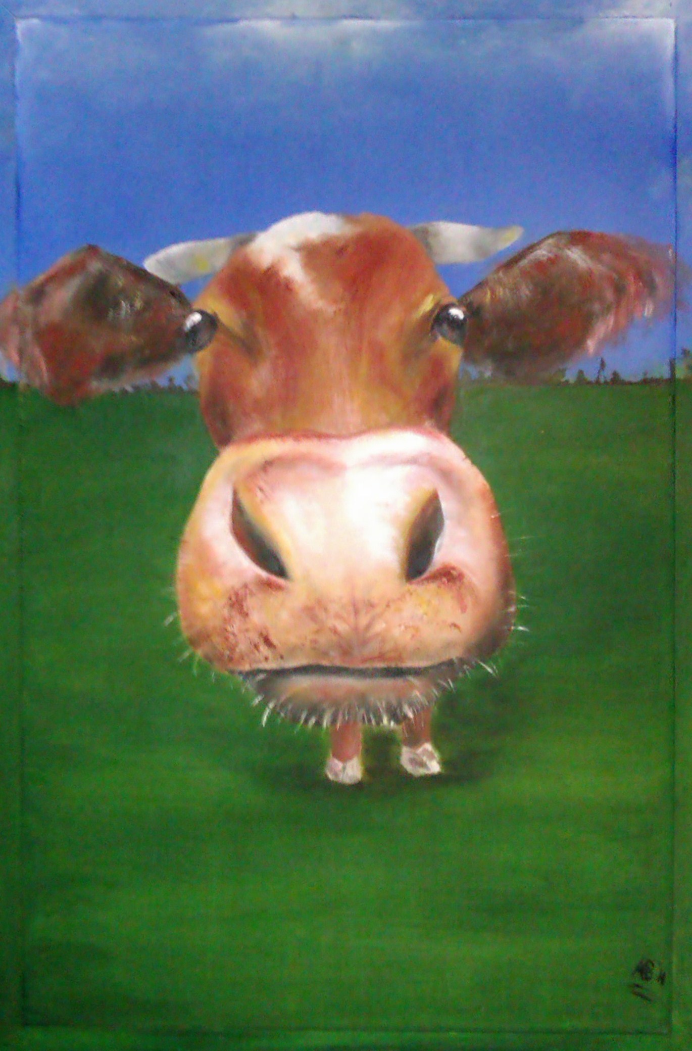 Koeiekop van dichtbij , doorgeschilderd op de lijst