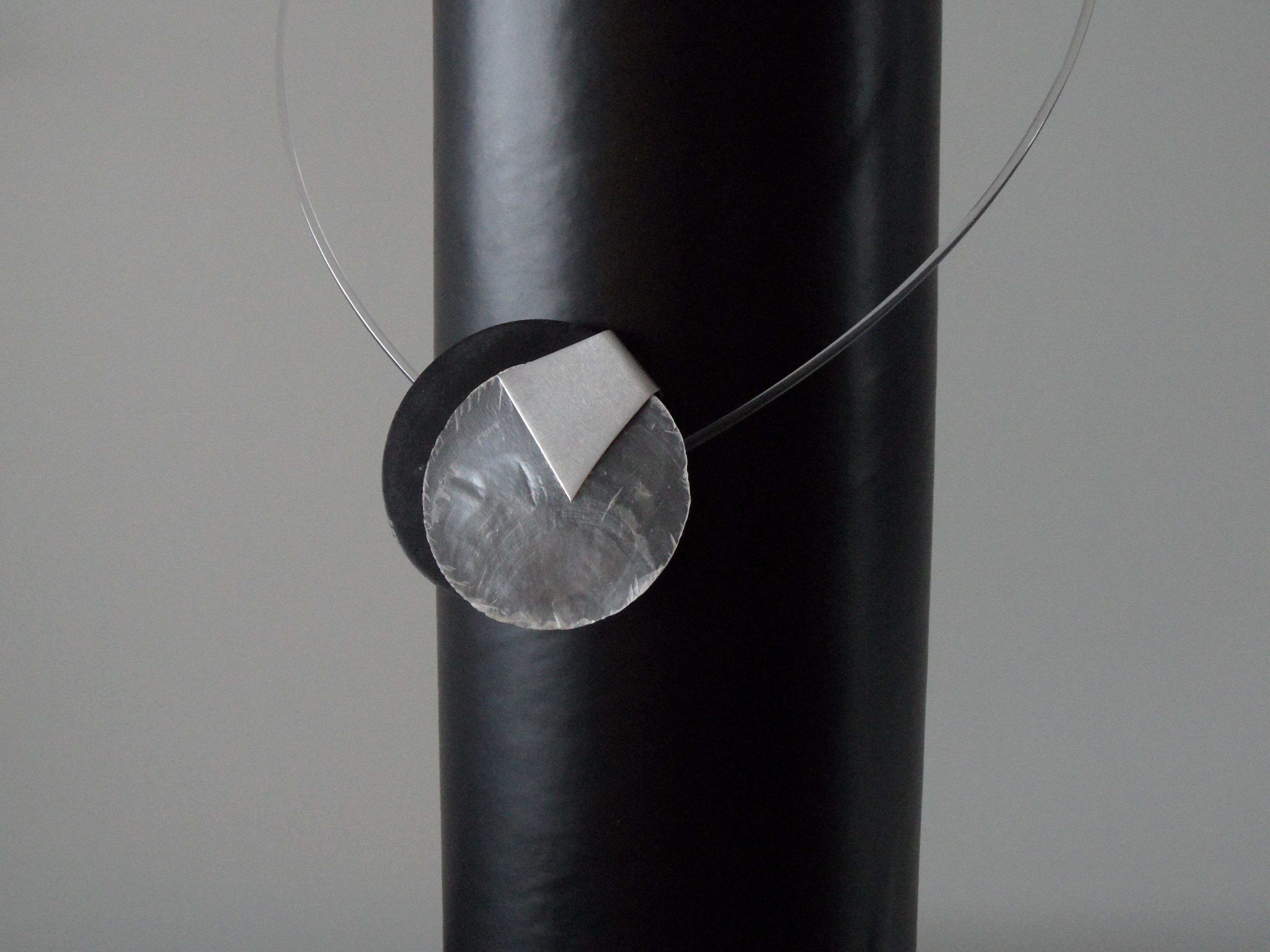 Rubber met parelmoerschijf gevat in aluminium. Perspex spang. Unisex sieraad. Ø 18 cm.