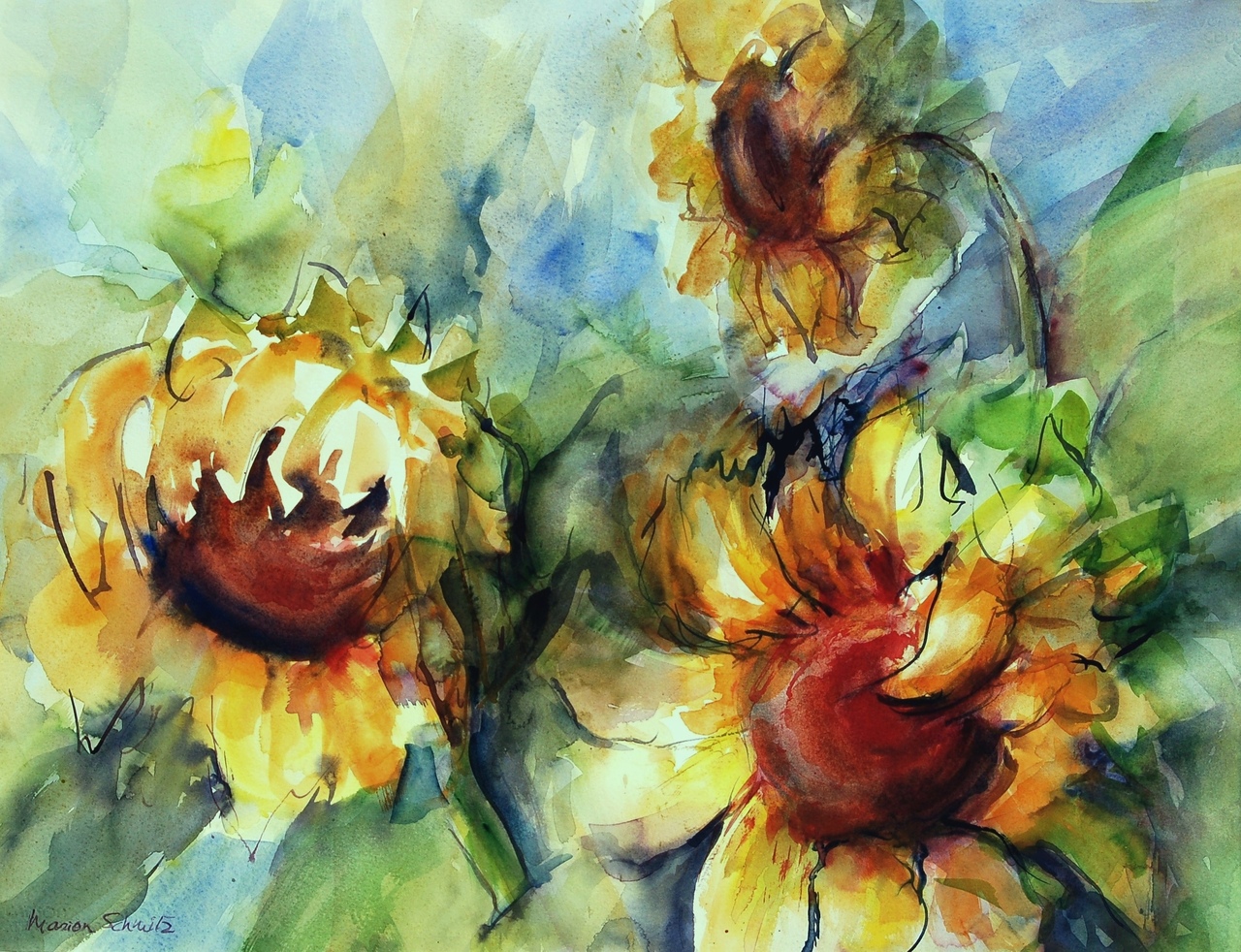 Zonnebloemen langs een maisveld, buiten geschilderd; gefixeerde aquarel geplakt op doek