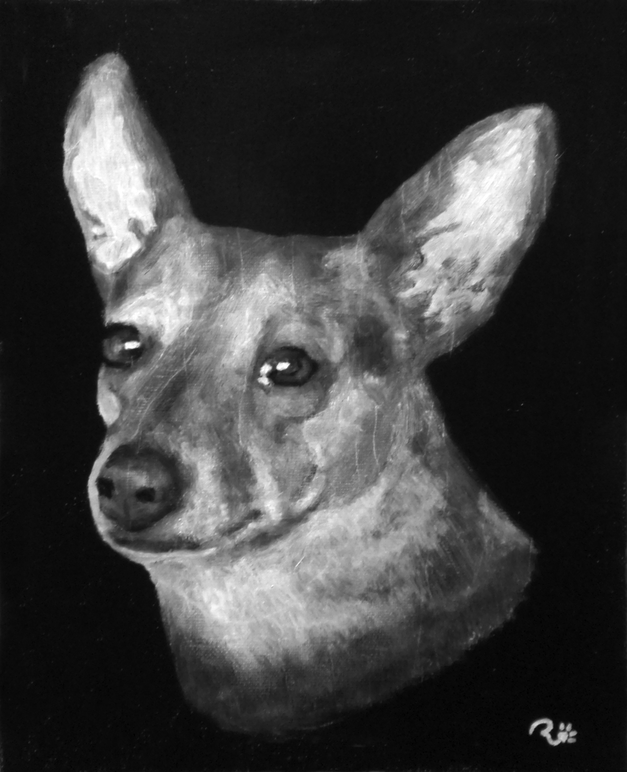 Zwart-wit portret van mijn eigen hond Billy, een kruising tussen een dwergpincher en een groter ras.