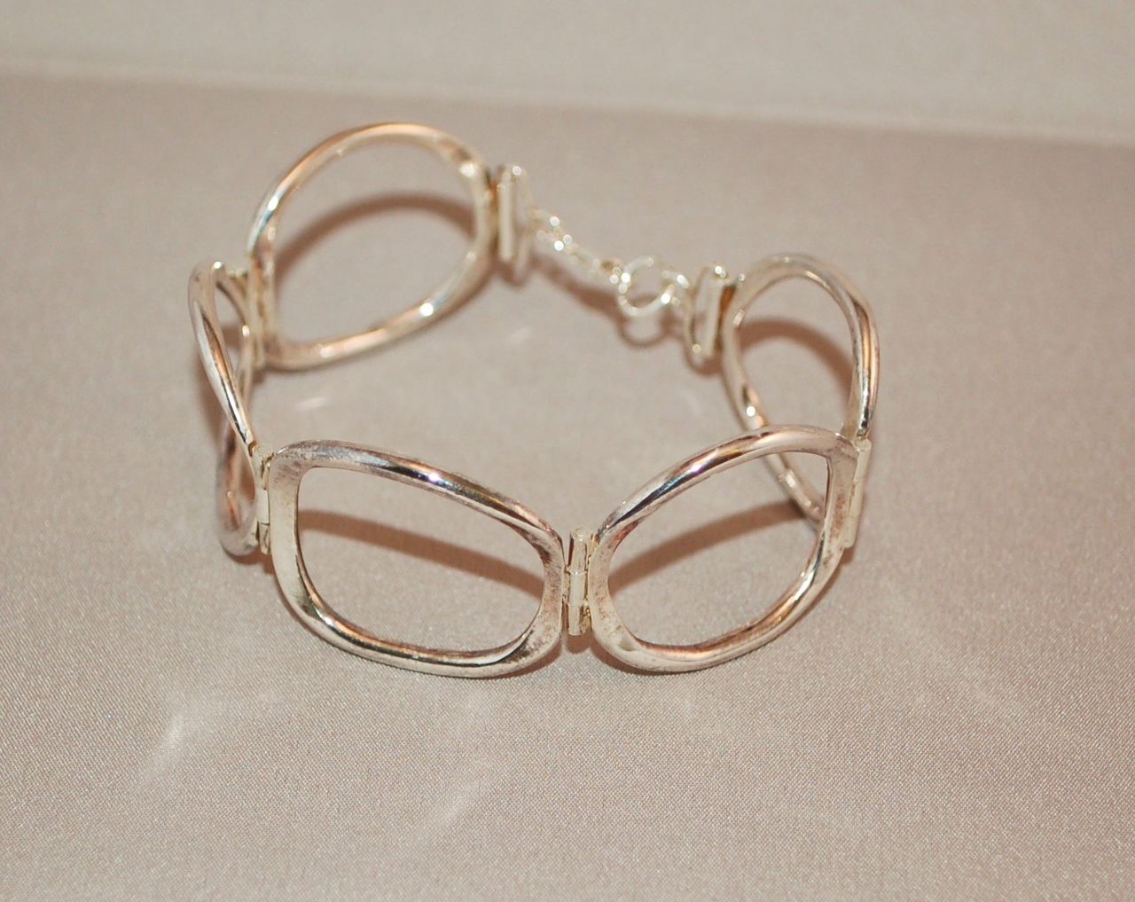 Deze armband is van grote zilveren niet geheel ronde schakels gemaakt. Deze schakels zijn onderling met een scharnier (techniek) aan elkaar verbonden, daardoor vormt de armband zich om de pols. De armband wordt dichtgemaakt middels een haak en oogsluiting.