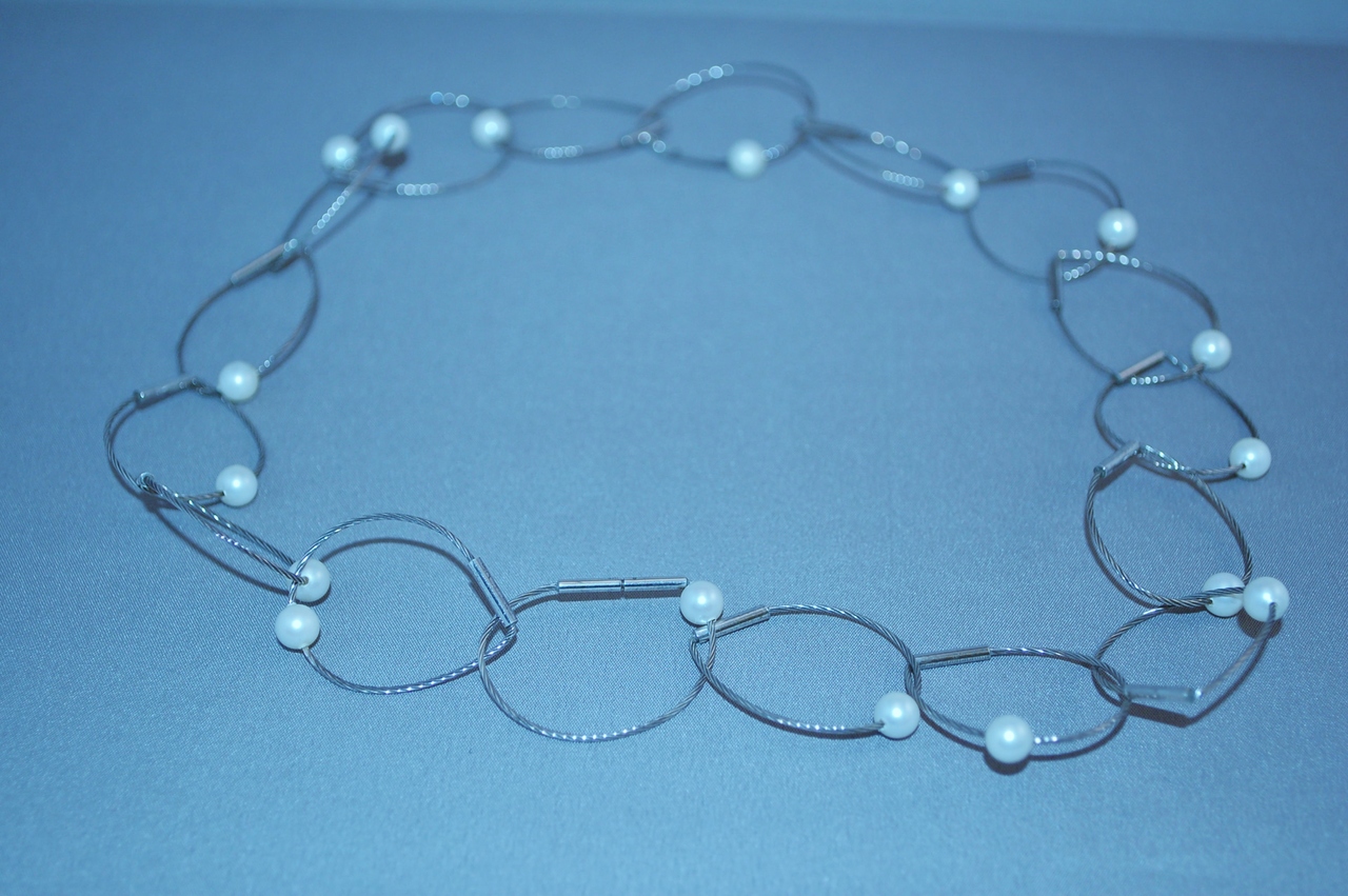 Deze ketting is gemaakt van zilver- kabeldraad schakels die onderling met elkaar verbonden zijn. Hierdoor ligt de ketting niet plat om de hals en beweegt speels tijdens het dragen. Aan elke schakel zit een zoetwaterparel. De sluiting is in het ontwerp verwerkt (bajonetsluiting). Totale lengte ketting 47 cm. Hoogte schakels 3,3 cm, parelgrootte 5,5 mm