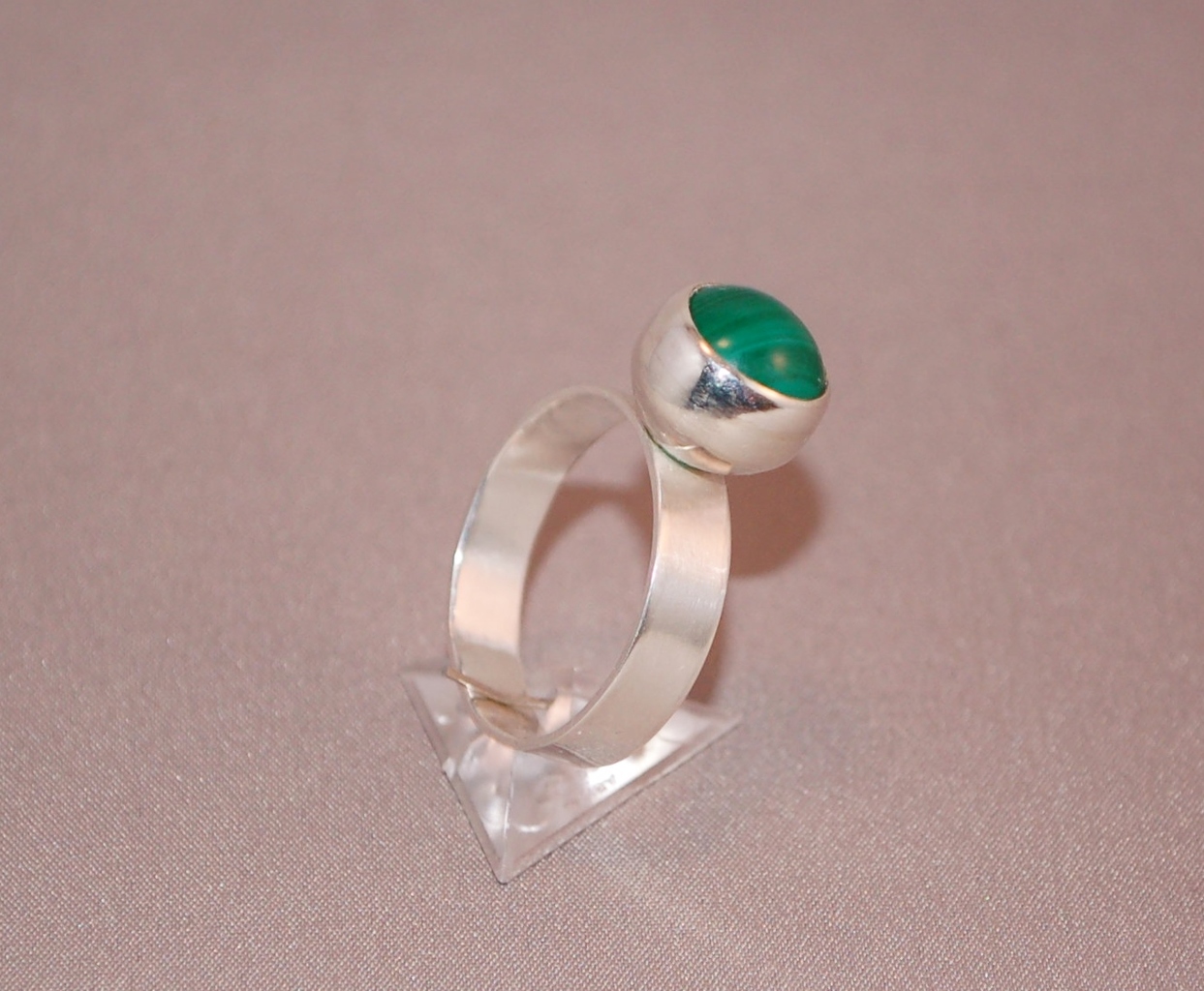 Deze zilveren ring heeft een bolle zetting waardoor de steen bovenop de ring komt te liggen. In de zetting zit een Malachiet cabochon steen van 10mm. ringmaat: 19mm doorsnee.