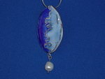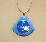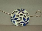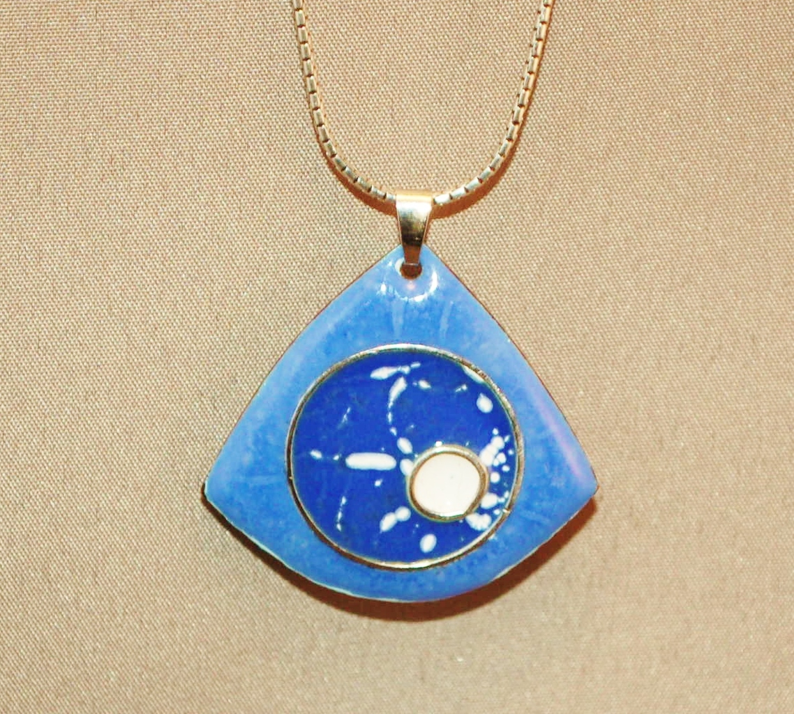 Deze hanger is gemaakt van emaille (blauw en wit) op koper met fijnzilveren cirkels. Het hangeroog is van zilver. afmetingen 2cm x 2 cm x 1 cm