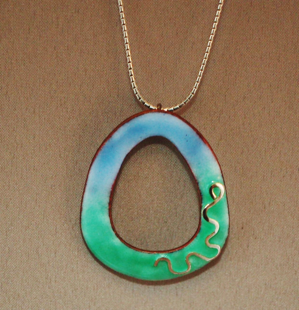 Deze hanger is gemaakt van emaille op koper ingelegd met fijnzilveren detail. De kleur blauw van de bovenkant van de hanger loopt gelijkmatig over in het groen van de onderkant. afmeting: + 4cm x 3 cm x 1cm