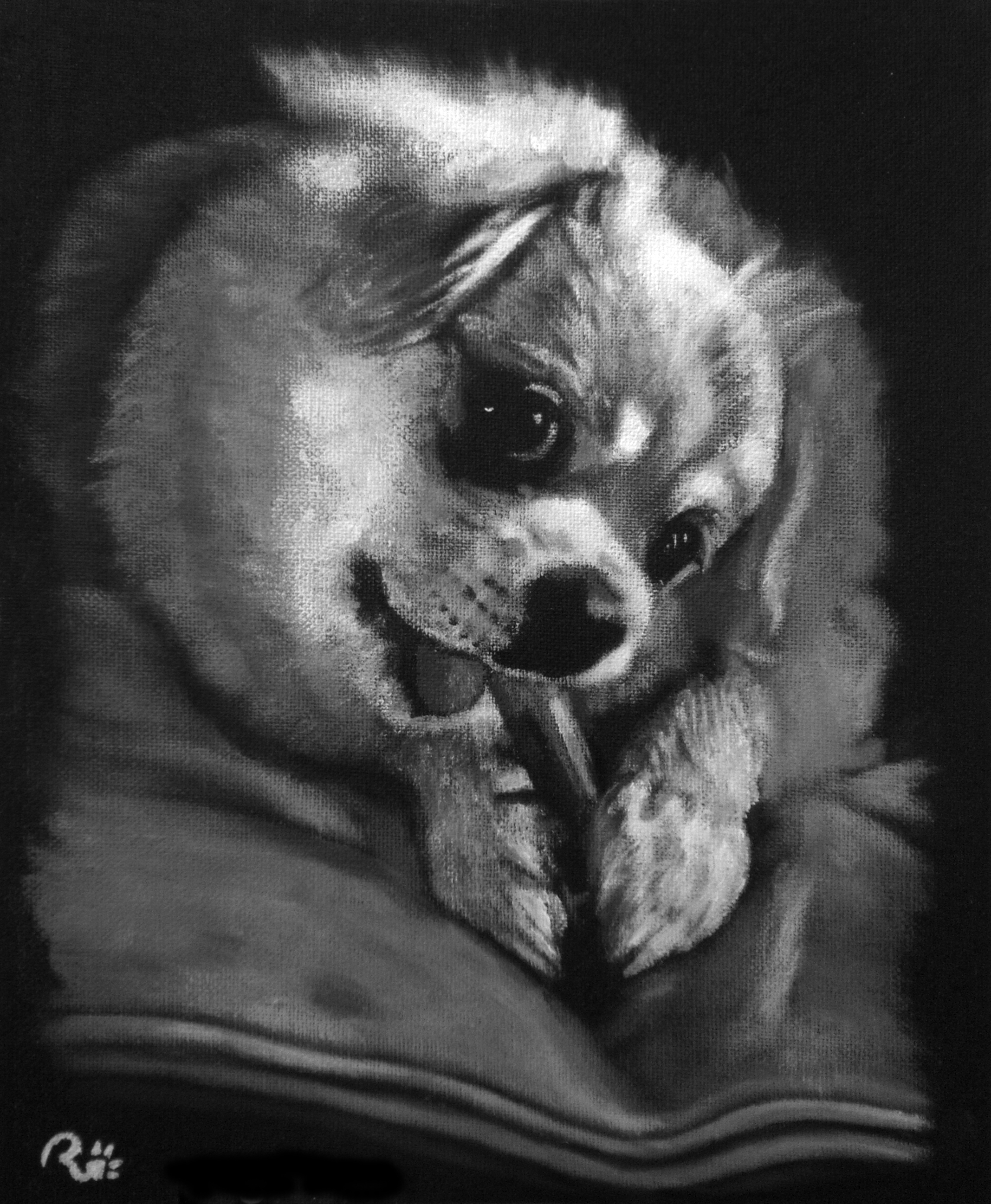 Zwart-wit portret van Kunga, een tibetaanse spaniel.