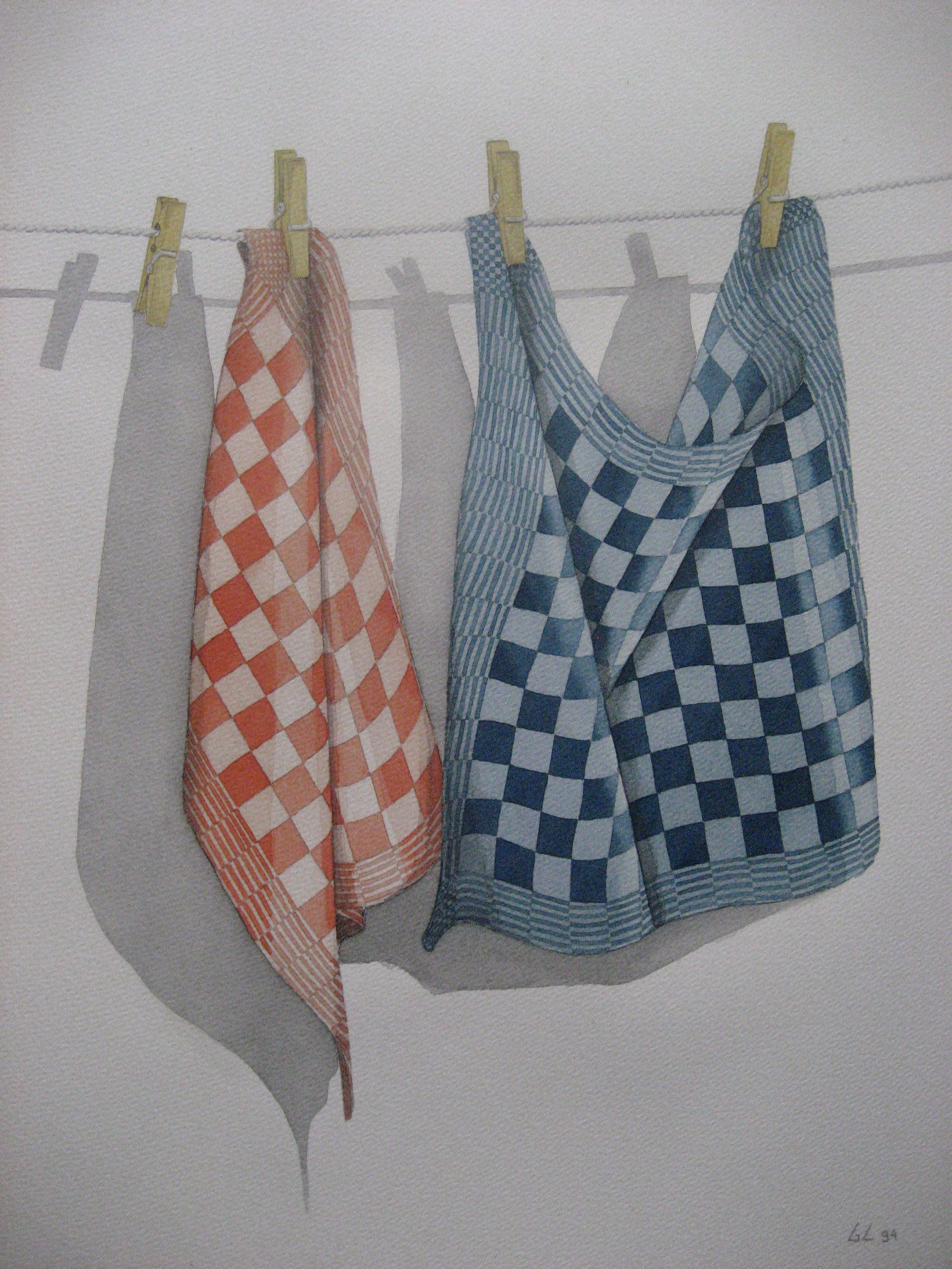 Aquarel Stilleven Bont Keuken Brabant Theedoek Brabants Rood Blauw Drogen Hangen