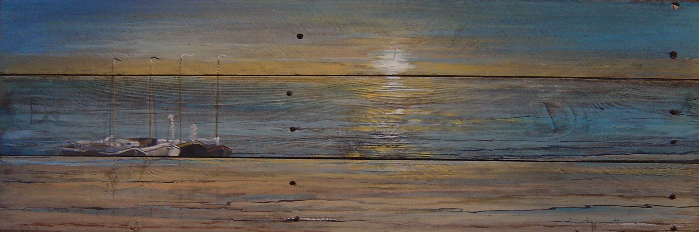 Boten op Het Wad, geschilderd op vergrijsd oud hout.