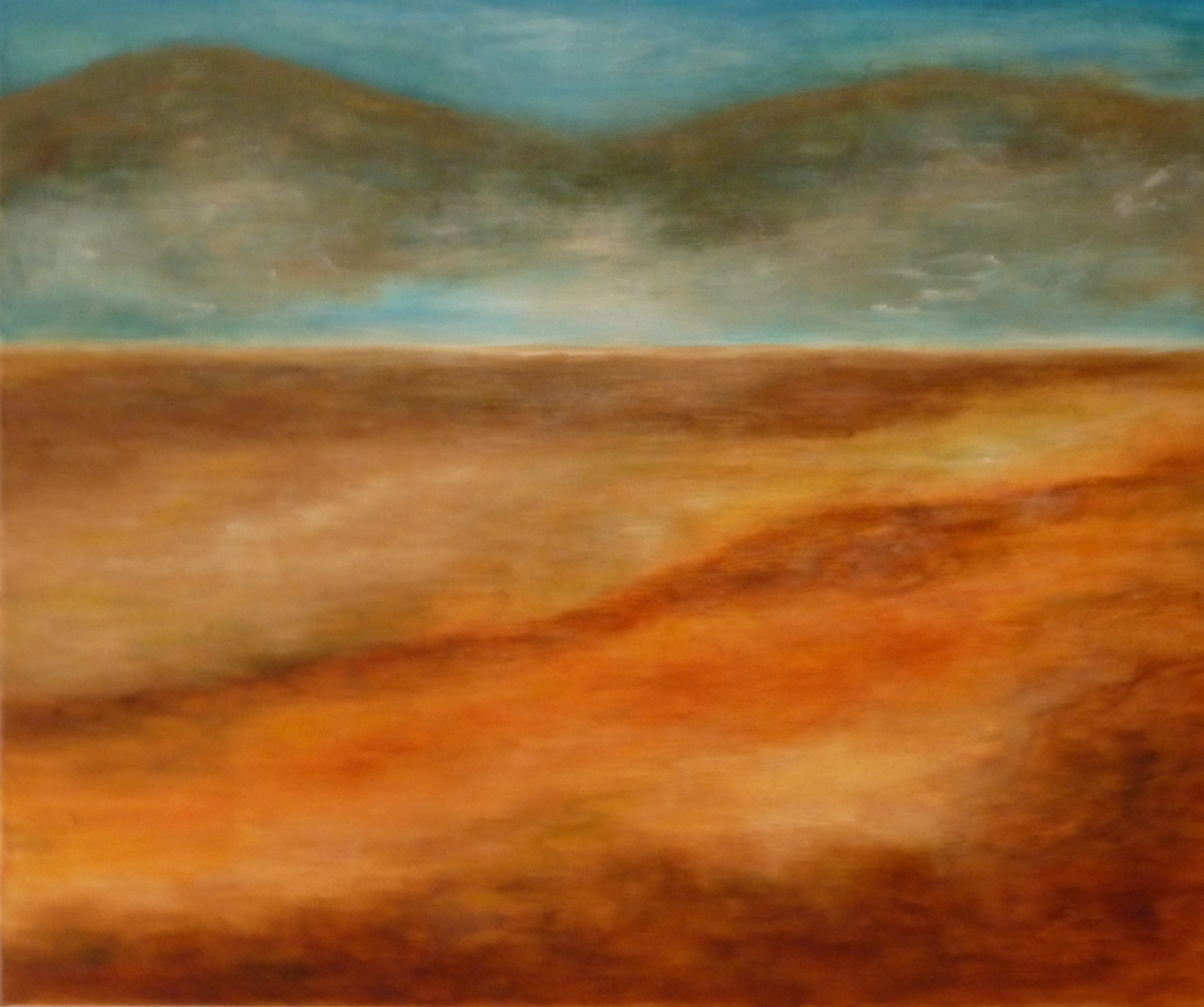 Landschap in bruin- en okertinten met bergen op de achtergrond