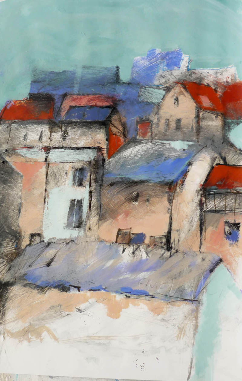 In de buurt van Dyon heb ik deze gemengde techniek gemaakt. De sfeer is daar totaal anders dan in de Provence wat tot uiting komt in de kleuren. De huizen zijn van natuursteen en grijzer dan in het zuiden.