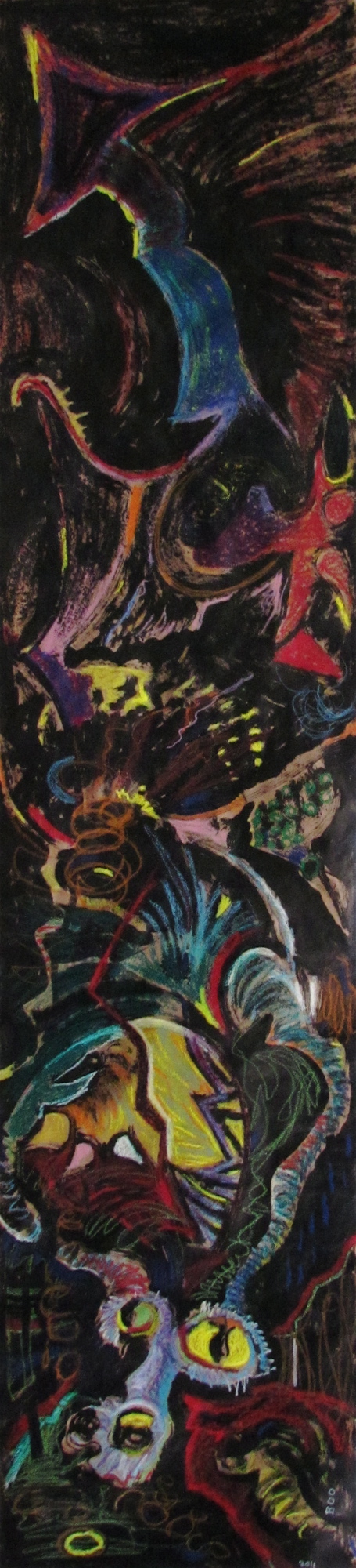 Draak, in oostindische inkt en olie-pastel, op pakpapier