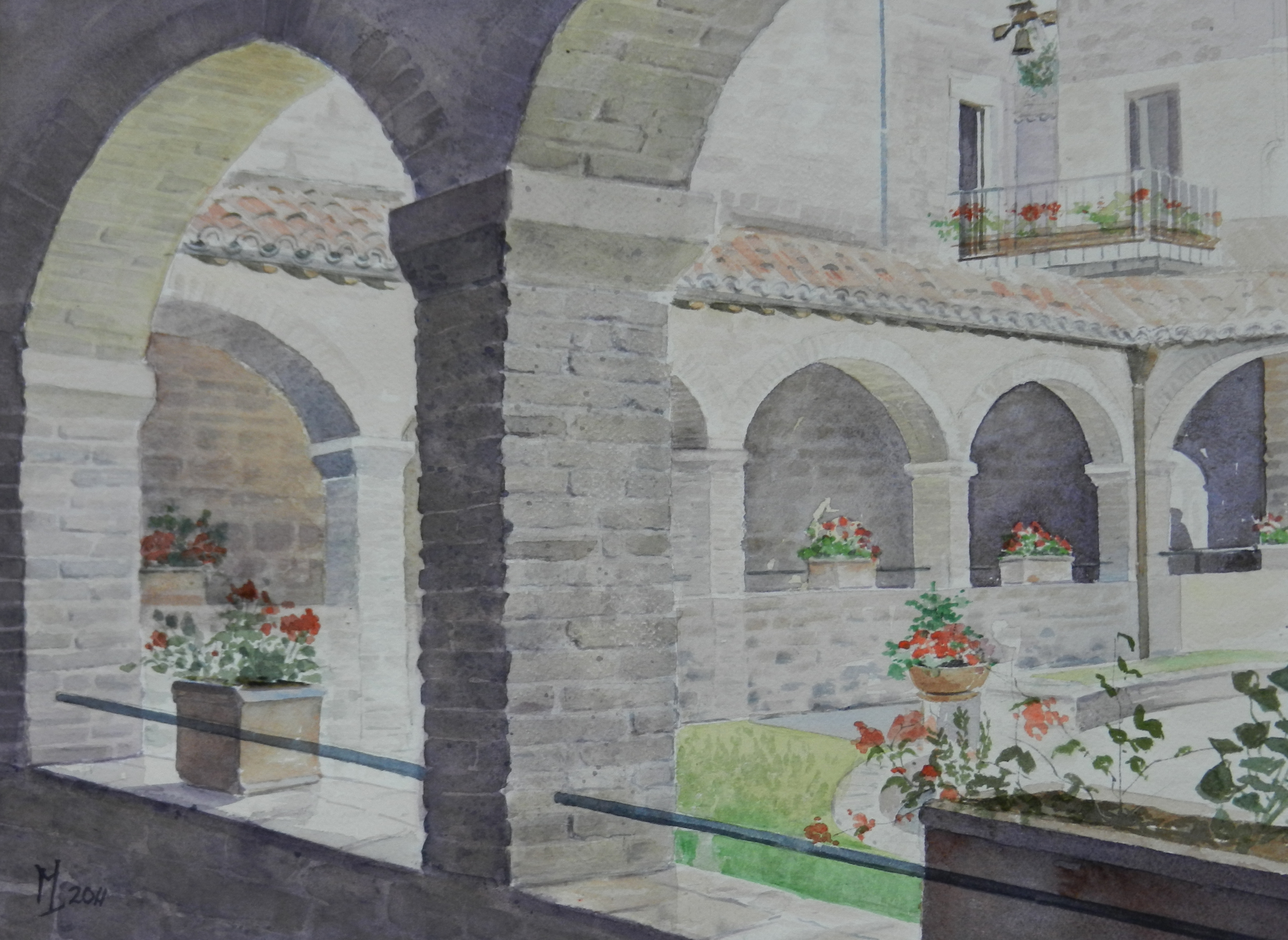 Deze aquarel is alleen als giclée (hoogwaardige kunstdruk) te koop Zie www.loeskouwenhoven.nl : "Giclée" in dit klooster werd Fransiscus van Assisi geroepen om "de kerk weer op te bouwen". Hij nam dit heel letterlijk en bouwde het vervallen kapelletje op. Wat later werd er een klooster gebouwd, dat bewoond werd door Clara en haar Clarissen.
