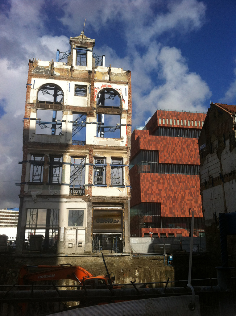 Vrijstaande gevel in een bouwput, Antwerpen. Bij het MAS (museum)