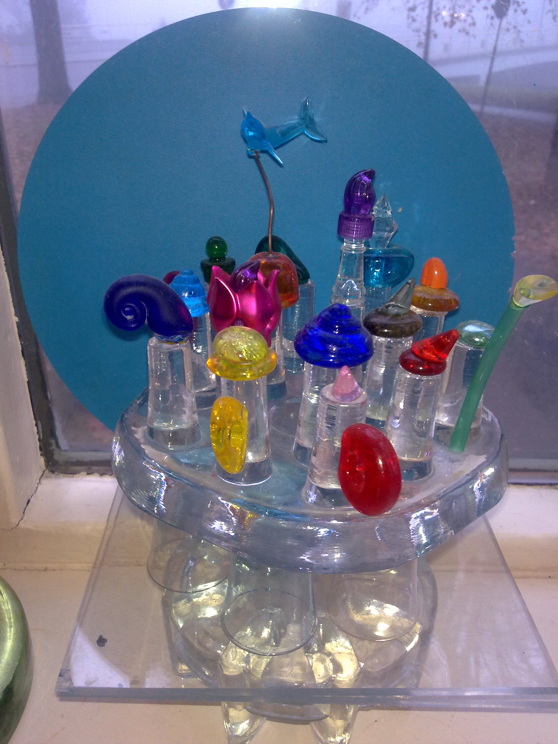 Van gevonden glas maakt lineke tulp objecten zoals totems, lampjes, couronnes en fantasiestukken.Glas wordt gebruikt zoals het is gevonden en niet bewerkt.Van iets onaanzienlijks iets moois maken en daarmee mensen verleiden tot een glimlach.
