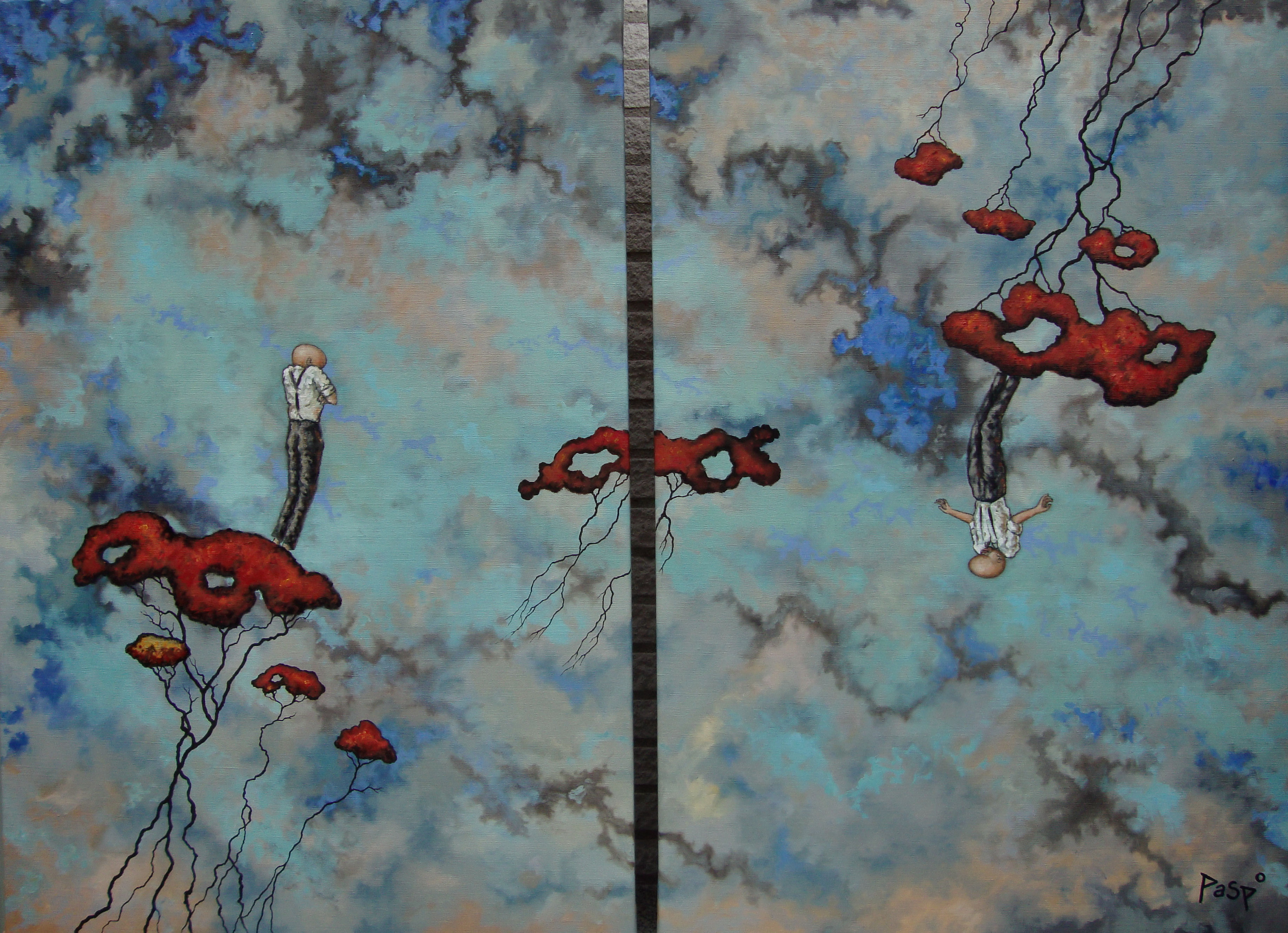 Werk uit de serie Koplopers. 2-luik. Twee koploper mannen die er ondsteboven van zijn. Hoe kan dit? Jongens toe nou! De zwaartekracht is heus geen speelgoed!