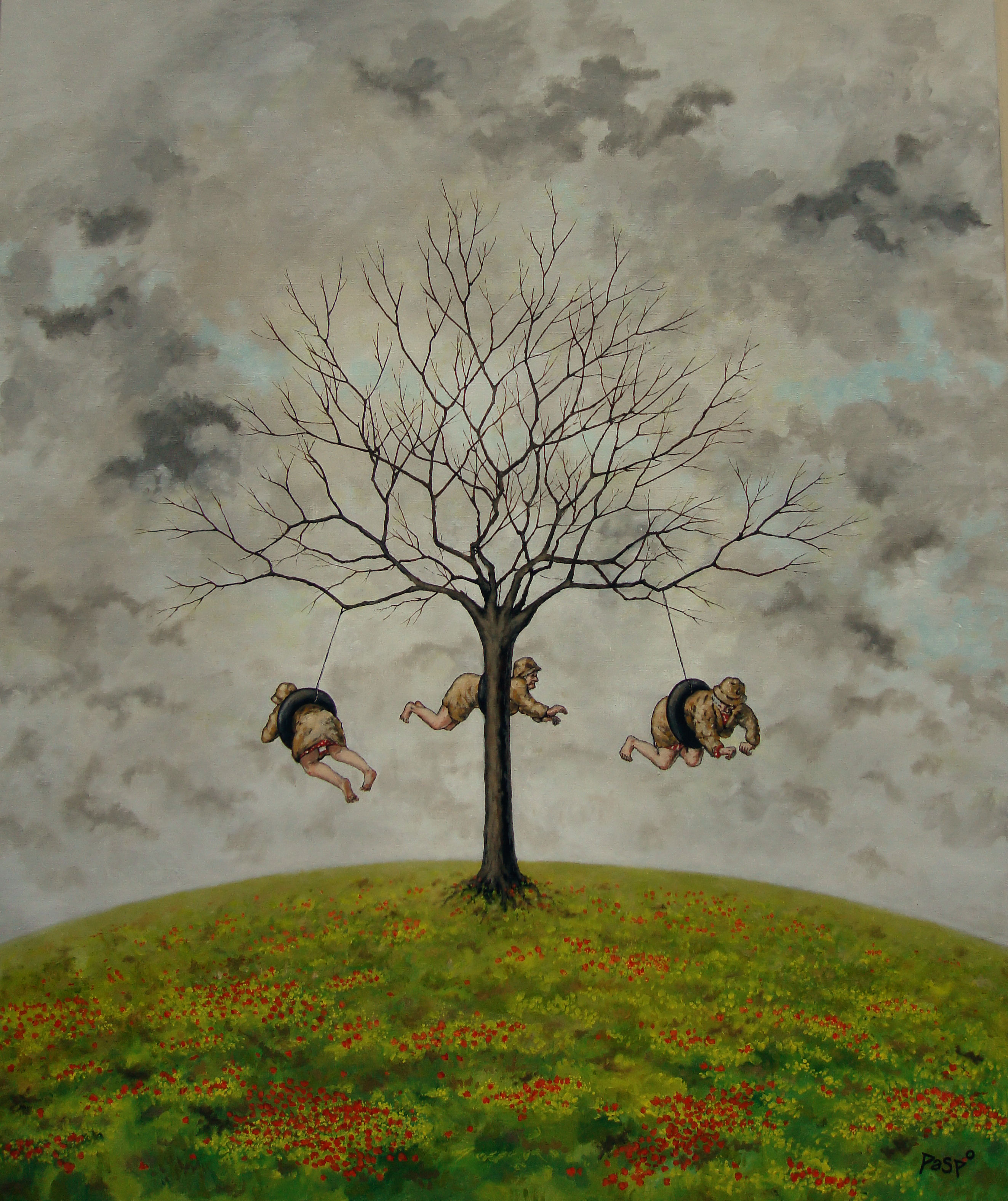 Figuratief Grijs Groen Tafereel Lucht Boom Drie Realisme Tak Karikatuur Humor Draaimolen Bejaard Ouderdom Heuvel Draaien Dames Trio Zwaaien Swingen