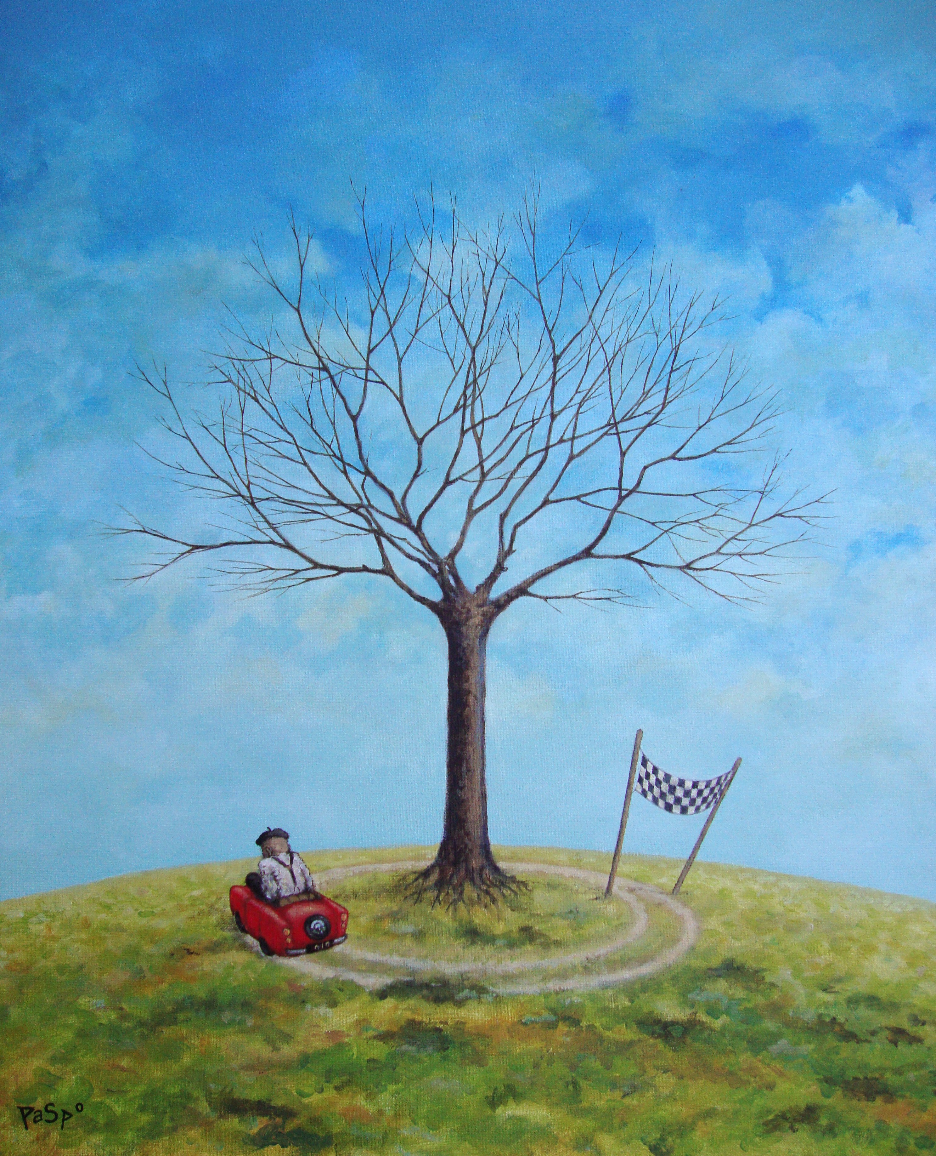 Figuratief Rood Blauw Groen Man Speelgoed Tafereel Verhalend Oud Boom Auto Realisme Takken Karikatuur Humor Heuvel Finish Cyclus Eindpunt
