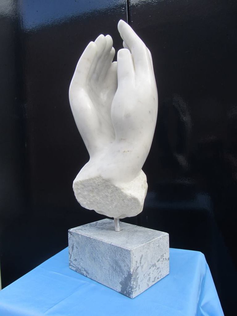 Een paar jaar geleden kreeg ik een prachtig stuk Carrara marmer van onze vriendinnen Atty en Ineke. Ik had direct het idee dat daar handen uit moesten komen. Maar ja........ Dit heeft gewacht tot het moment dat ik ( op zoek naar de vormen van benen ) in een boekje over Auguste Rodin de handen van hem tegen kwam. Ik wist op dat moment .......... en ben aan de gang gegaan, met dit als resultaat. Het geheel moet nog op een voetje geplaatst worden......