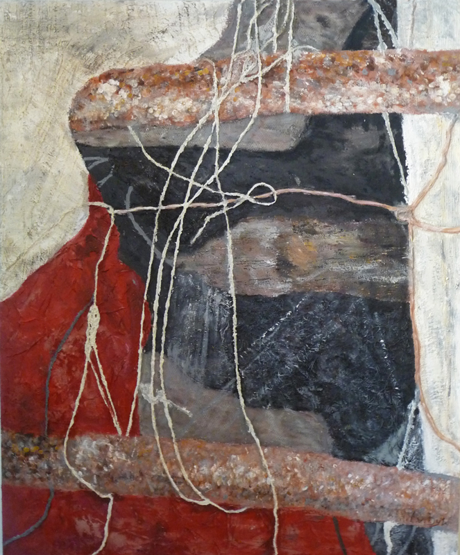 Iets in de buitenwereld intrigeert mij en door deze impressie uit te werken wordt zij blijvend deel van mijn binnenwereld. Laag na laag bouw ik aan de uiteindelijke vorm. Tijdens het werken komt er een stroom van associaties op gang. Het is een constant zoeken naar evenwicht tussen de verf en de andere materialen.