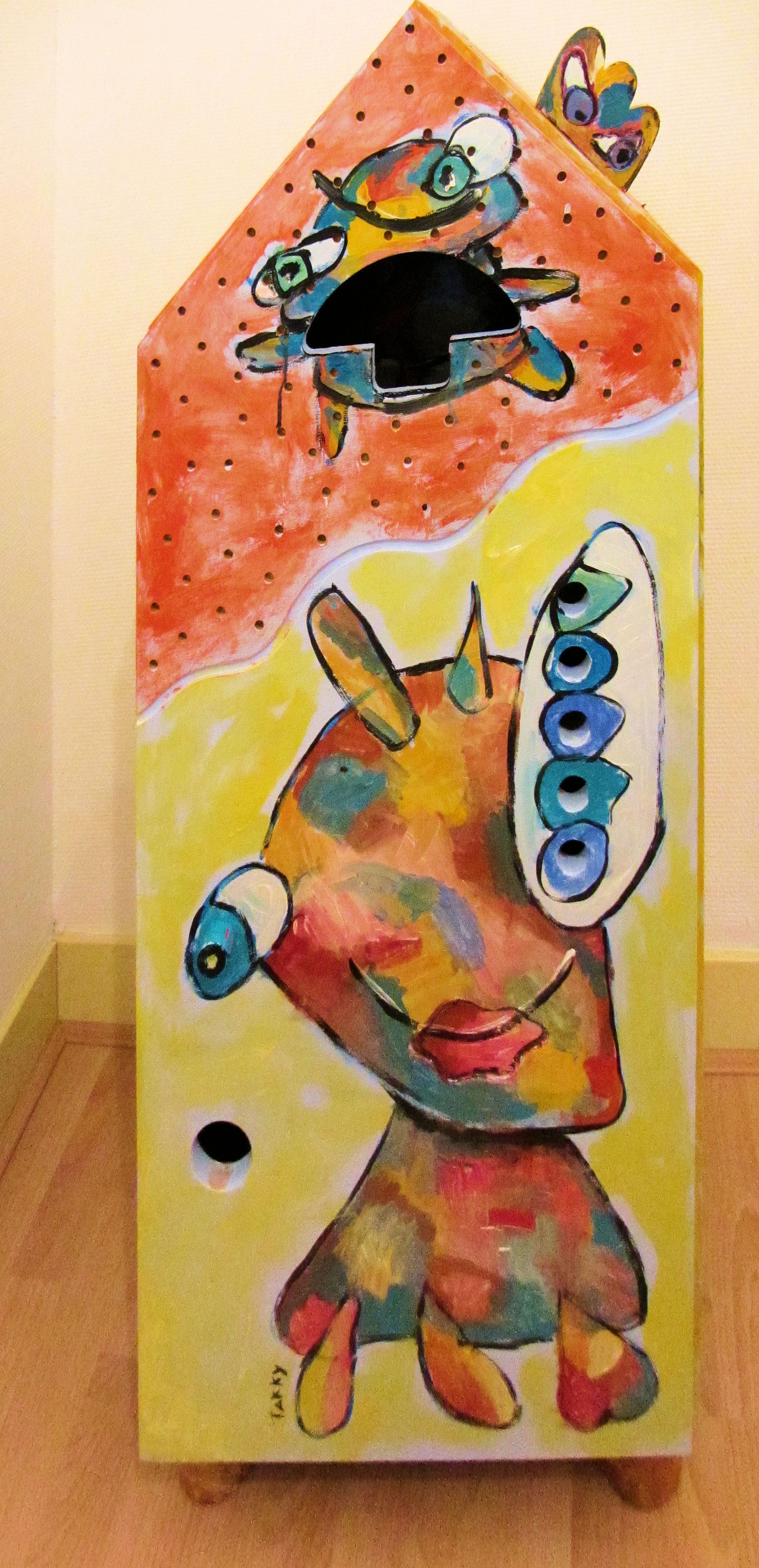 een kastje met spelende dieren en kinderen ,elke kant is iets op geschilderd ,bovenkant onderkant voorkant achterkant ,binnenkant plankjes ook boven en onderkant ,vrolijk kleur liefdevol