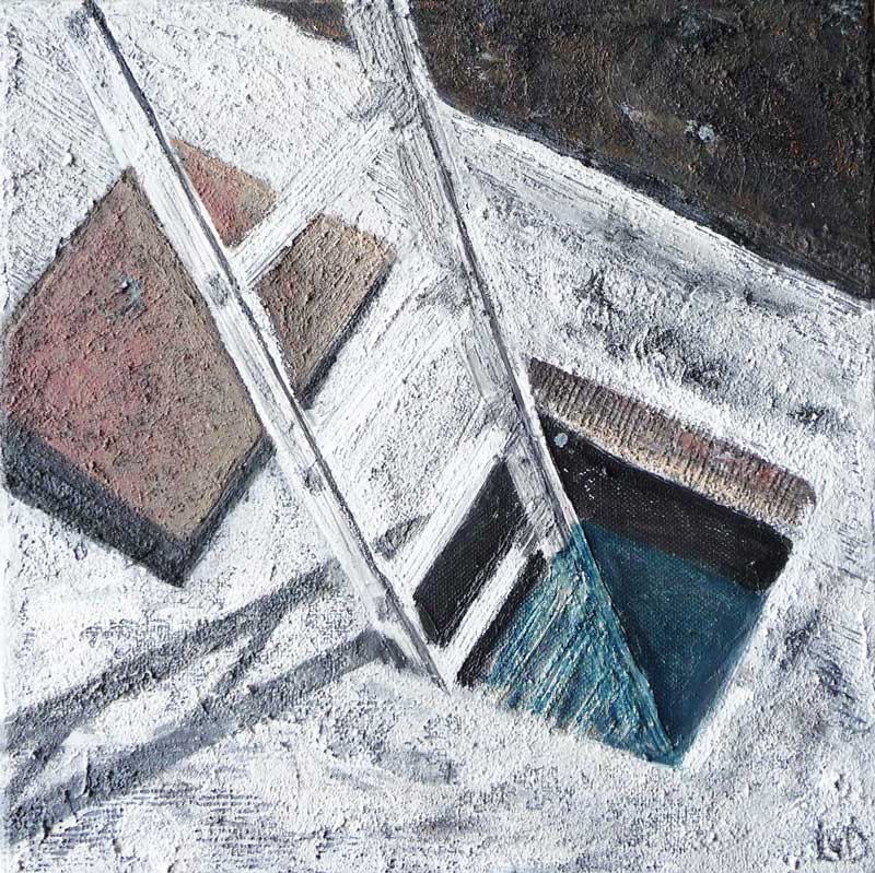 Iets in de buitenwereld intrigeert mij en door deze impressie uit te werken wordt zij blijvend deel van mijn binnenwereld. Laag na laag bouw ik aan de uiteindelijke vorm. Tijdens het werken komt er een stroom van associaties op gang. Het is een constant zoeken naar evenwicht tussen de verf en de andere materialen.