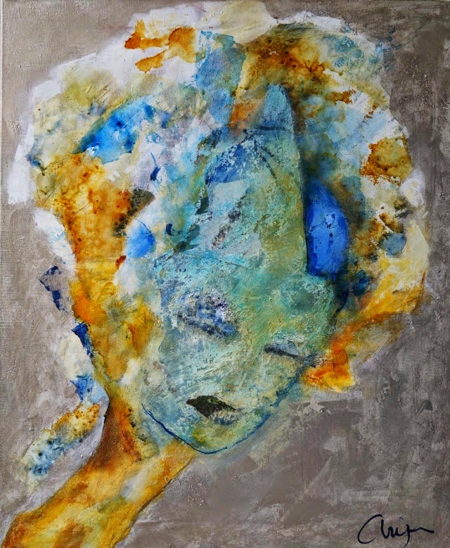 'Mijn mens' ontstaat toevallig; in een wirwar van lijnen, vlekken en kleuren zoek ik mensen (meestal vrouwen en kinderen) die met elkaar verbonden zijn en die meestal 'niet perfect' zijn.