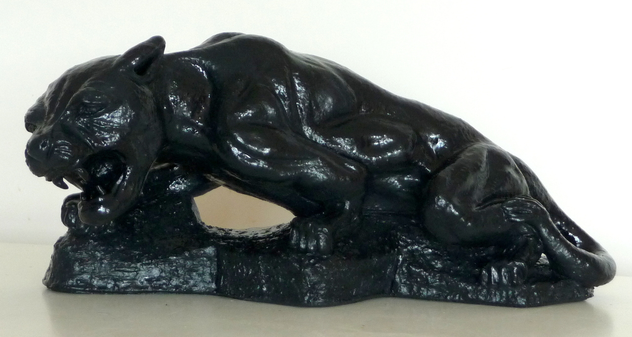 panter, handgevormd van klei, ovengestookt op 1220°, weerbestendig.