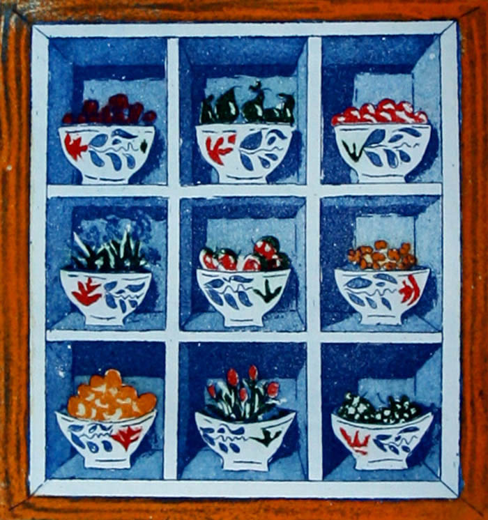 3x3 is 9 vakken gevuld met een boerenbonte kom in een lijst van 40x40