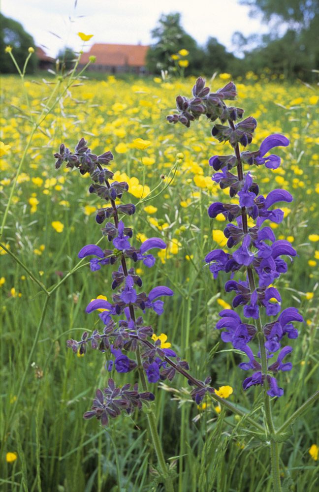 Mooi kleurencontrast van het blauw van de veldsalie (Salvia pratensis) met het geel van de boterbloemen.
