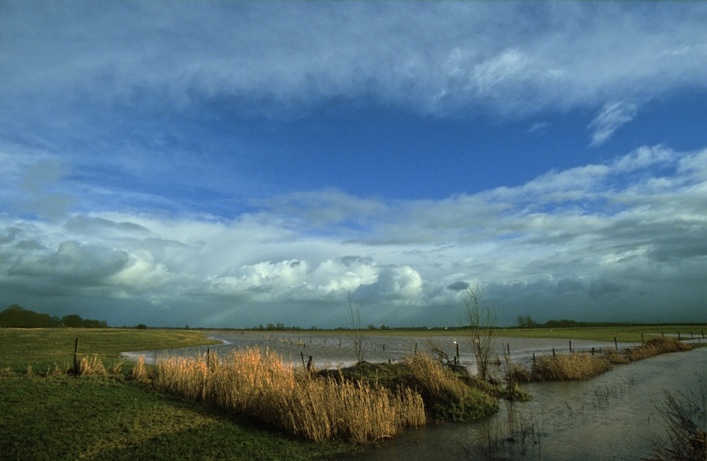 In december met natte sneeuwbuien en natte uiterwaarden zijn de landschappen soms erg dramatisch.