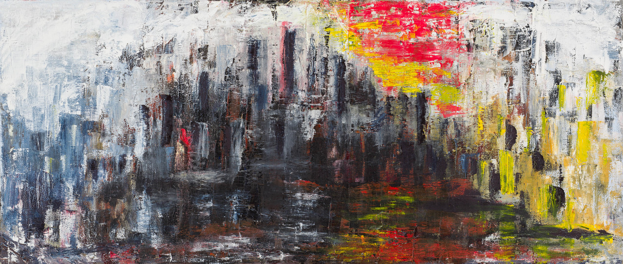 Recycle y'r old paintings! Abstract stadsgezicht paletmesschilderij over oud schilderij 040