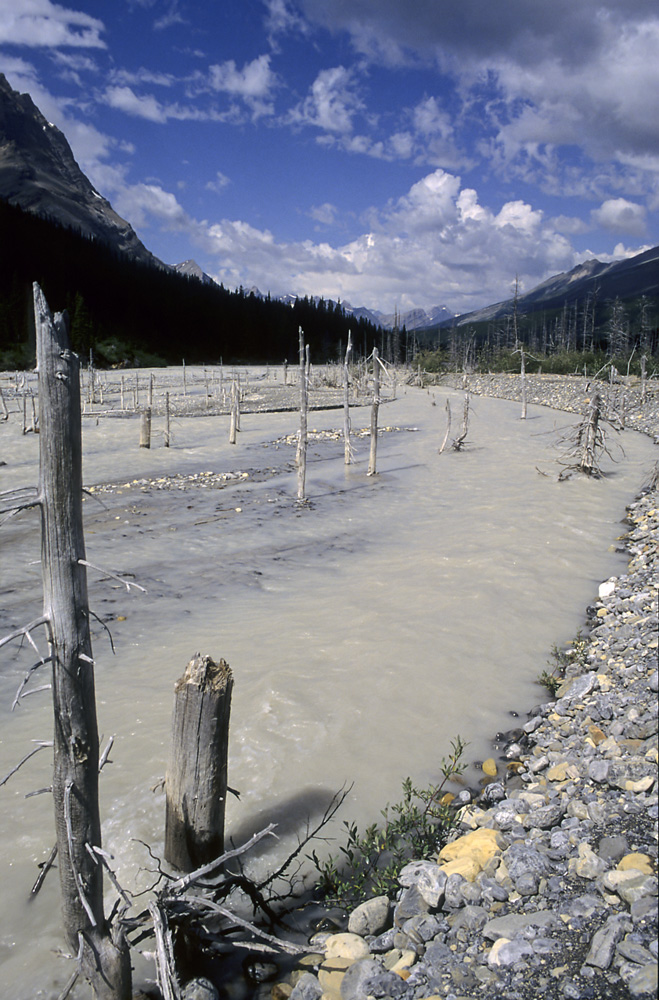 Een riviertje van smeltwater en een hoop sediment. De stammetjes in de rivier verraden dat deze plek niet altijd rivierbodem is geweest. Het riviertje wat hier stroomt ligt dicht bij de Mt Robson en heet de Moose river.