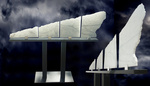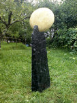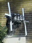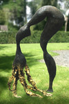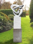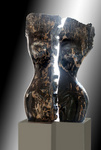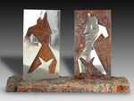 Twee abstacte figuren, een positief de ander negatief, in staal- en roestvast staalplaat op sokkel van graniet