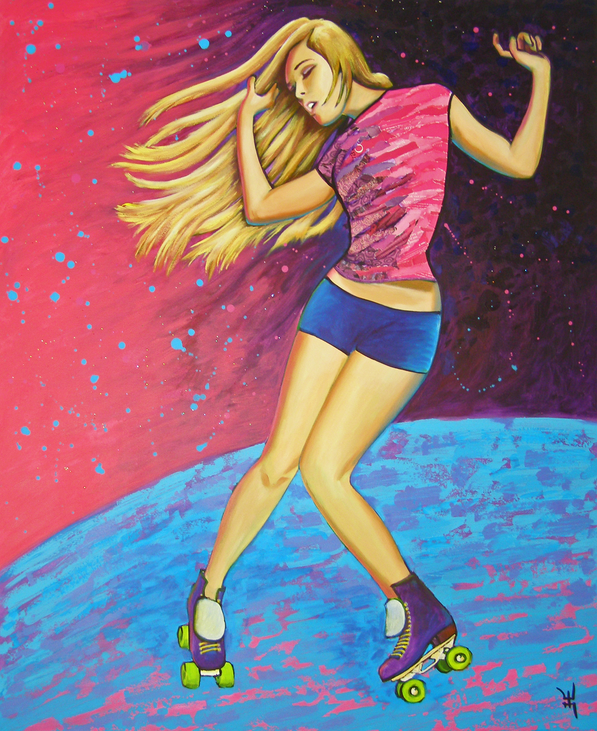 Rollergirl dansend op groovy tunes. 120 x 100 cm op 3D canvas. shirtje is gemaakt van papiersnippers en op de achtergrond zijn glitters verwerkt.