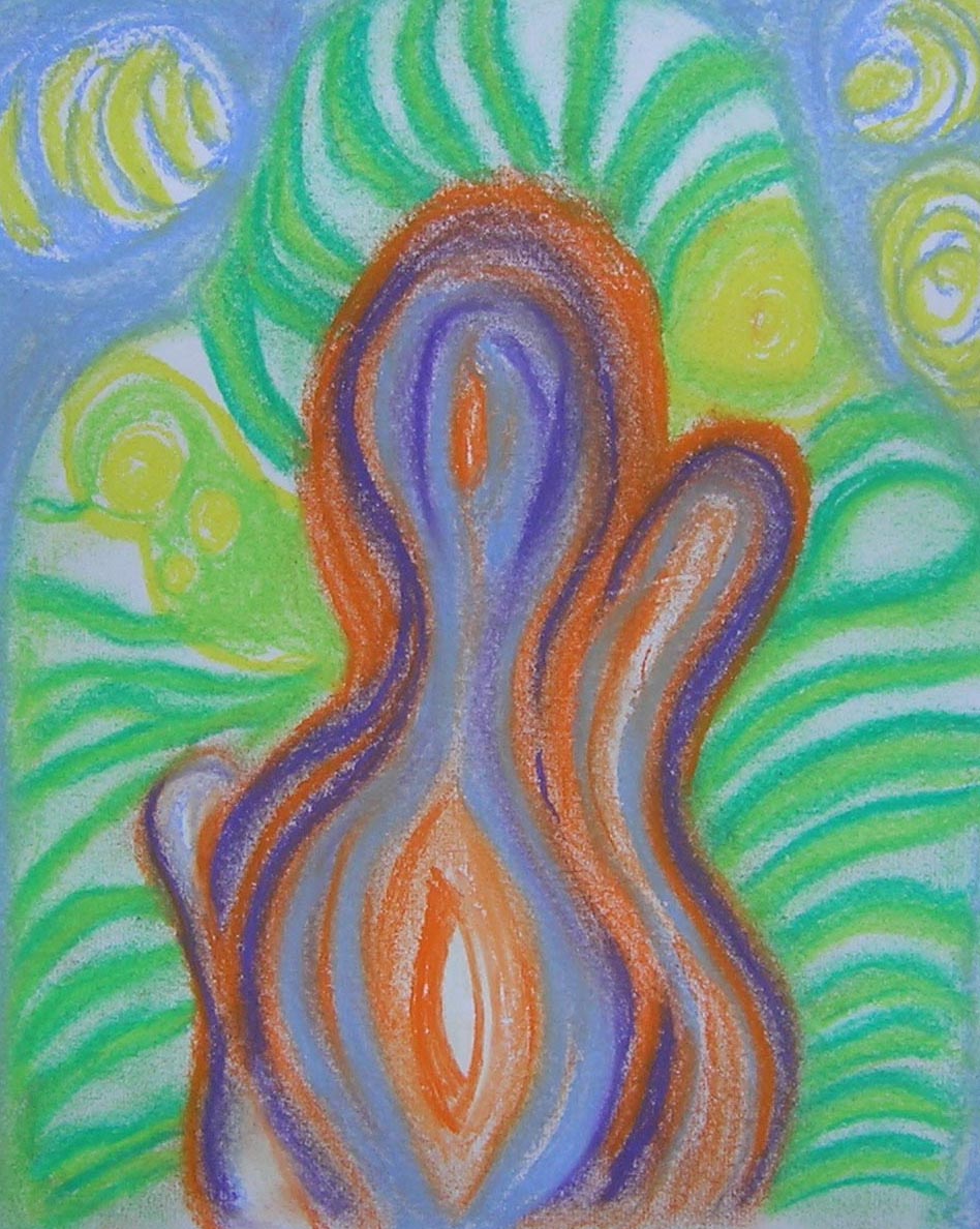 Intuitief getekend met pastelkrijt in sprekende kleuren.