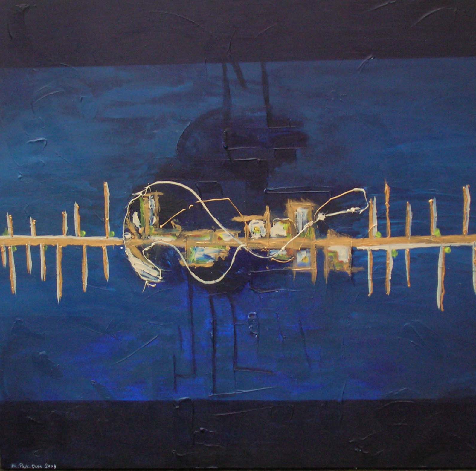 Intuitief schilderij. Hoofdkleuren blauw en goud.