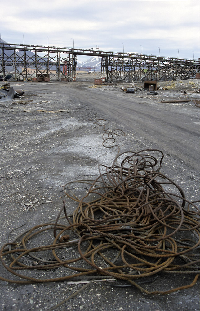 Een roestigge kabel tussen de rommel, achtergelaten door de bewoners van het russische stadje Pyramiden (Spitsbergen).