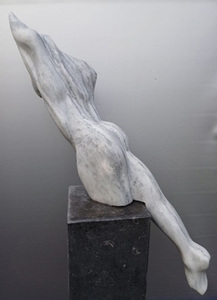 Hans van Uden werkt met harde natuursteen waarbij het een deel van de oorspronkelijke steen laat bestaan . Daarnaast combineert hij steen met Kortenstaal