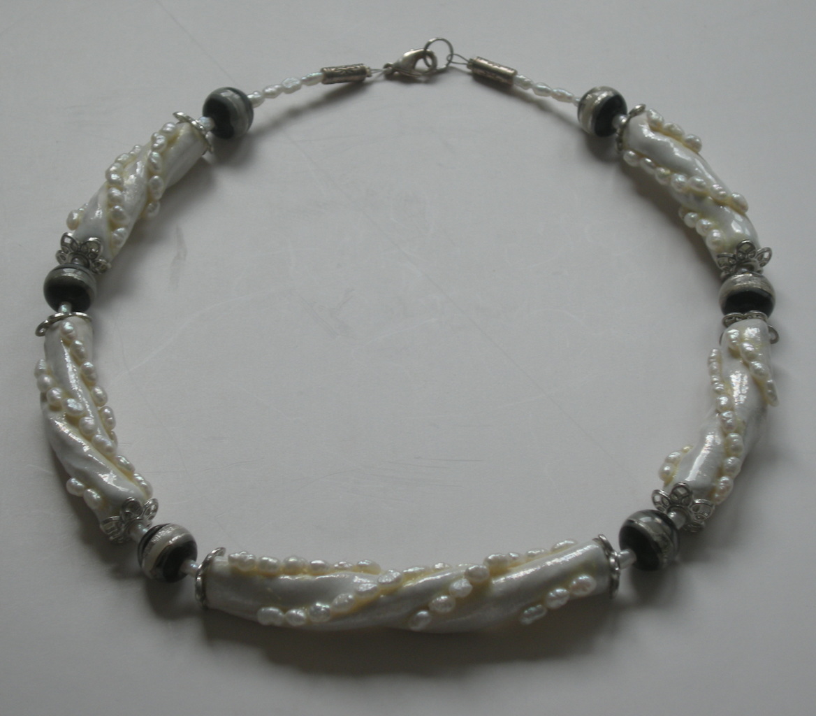 hals sieraad van wit geglazuurd porselein versierd met zaadparels en gecombineerd met venetiaans glas