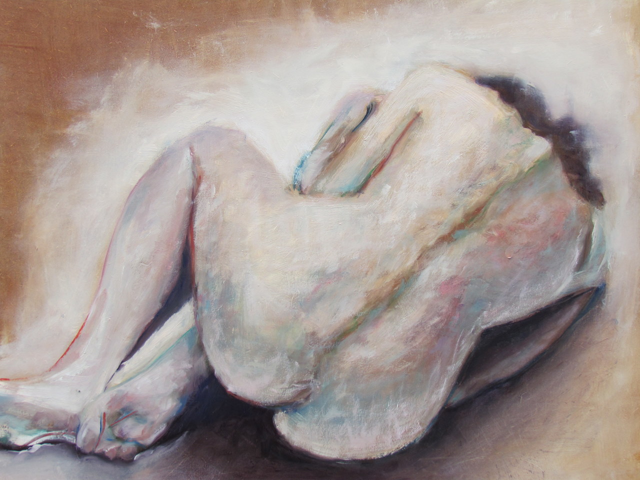 Naakte vrouw liggend op de rug gezien.