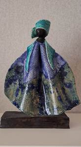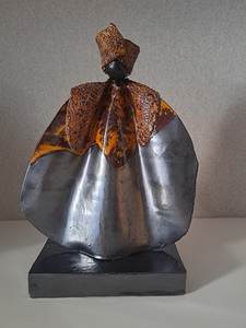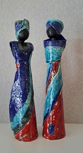Een zittende vrouw op een sokkel en een staande vrouw zijn in gesprek met elkaar. Beide zijn zwart geglazuurd met rode kanten kleding. Het kant van de kleding is met verschillend motief. De sokkel waarop de zittende dame plaats heeft is verzwaard met gietbeton voor het evenwicht. De sokkel is in de kleuren van de dames. De afmeting zoals gegeven is van de 2 vrouwen samen.