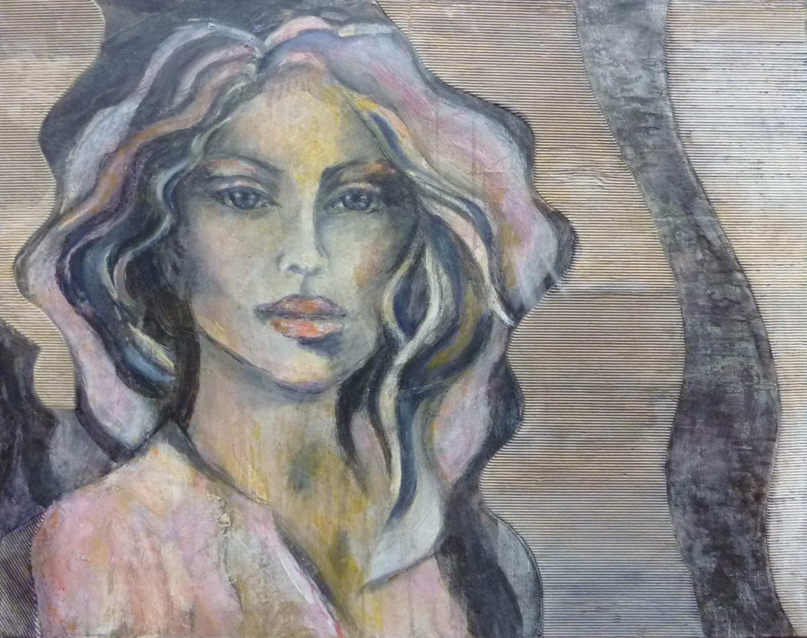 Met veel materialen o.a. golfkarton, pigmenten en acryl