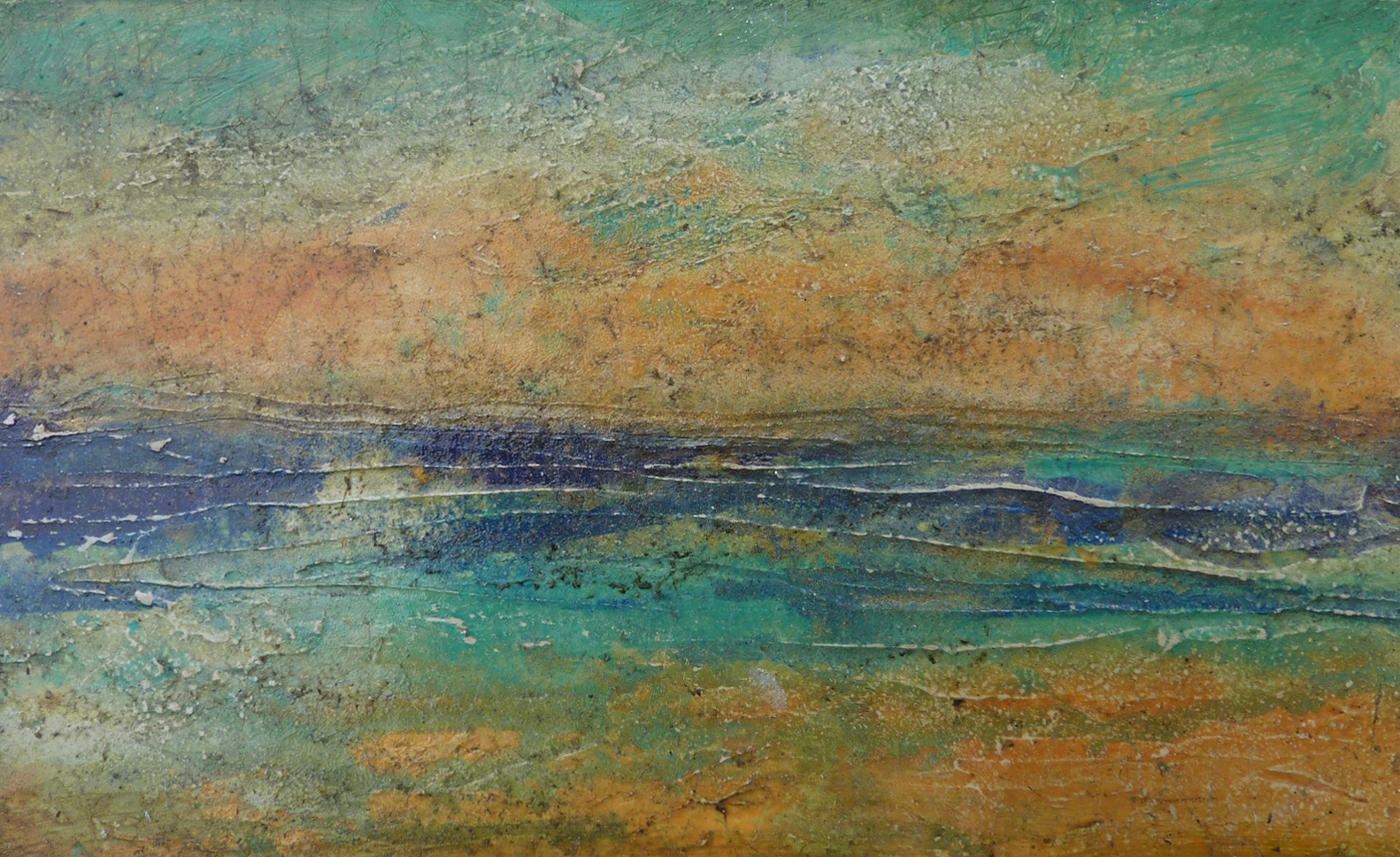 Zeegezicht op Ile de Ré. Met brede houten lijst. “Altijd al geboeid door de veelzijdigheid van de natuur en de mysterie van veel dingen om ons heen". "Je ziet in mijn werk vaak verschillende materialen en combinaties van technieken. Veel structuren, spatten verf, stukken papier, pigment poeders, transparante acryl, zelfgemaakte verf, kalk, lijm, etc. Ik probeer tijdens het schilderen een stuk innerlijke schoonheid te weer te geven, een gevoel, een gedachte, eigenlijk dat wat je niet ziet …”