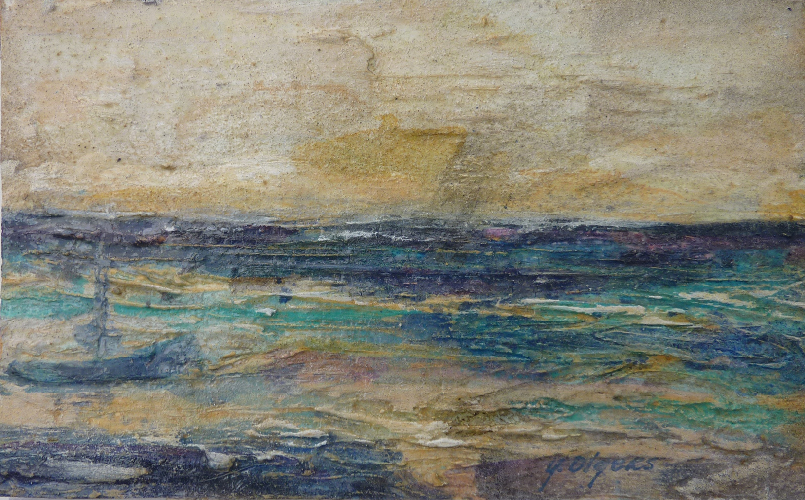 Zeegezicht op Ile de Ré. Zonder lijst op paneel. “Altijd al geboeid door de veelzijdigheid van de natuur en de mysterie van veel dingen om ons heen". "Je ziet in mijn werk vaak verschillende materialen en combinaties van technieken. Veel structuren, spatten verf, stukken papier, pigment poeders, transparante acryl, zelfgemaakte verf, kalk, lijm, etc. Ik probeer tijdens het schilderen een stuk innerlijke schoonheid te weer te geven, een gevoel, een gedachte, eigenlijk dat wat je niet ziet …”