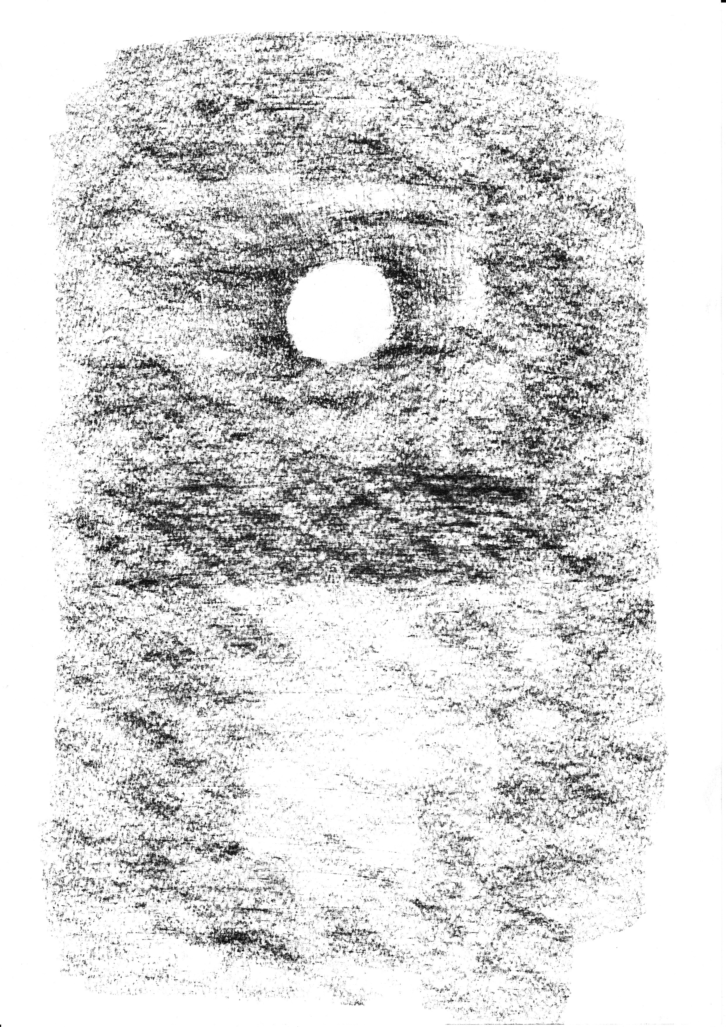 De volle maan verlicht een glad wateropppervlak. Door de volle maan is de nacht licht. Een tijd van wijsheid, onrust, gekte en geilheid. Van uitbundig plezier en andere heftige gevoelens.