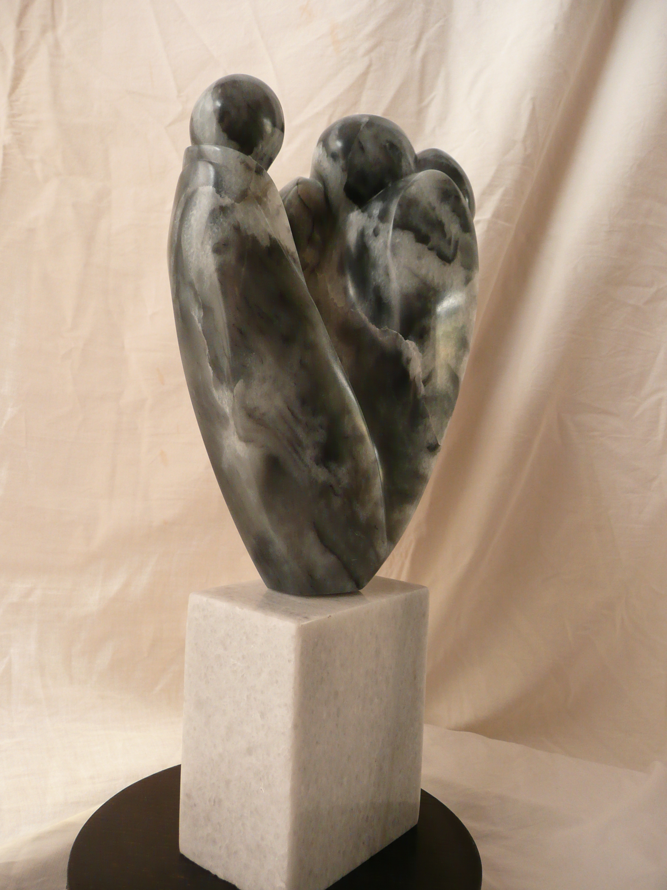 Voor het vervaardigen van dit werk is speksteen gebruikt. Een zachte steen. Als start heb ik de steen van een nieuwe huid voorzien en vervolgens, tsja, vervolgens, ontstond er een figuratief iets. Iemand vroeg me: "Hoe ga je dit werk noemen?". "Gezelschap, dat lijkt me aardig".