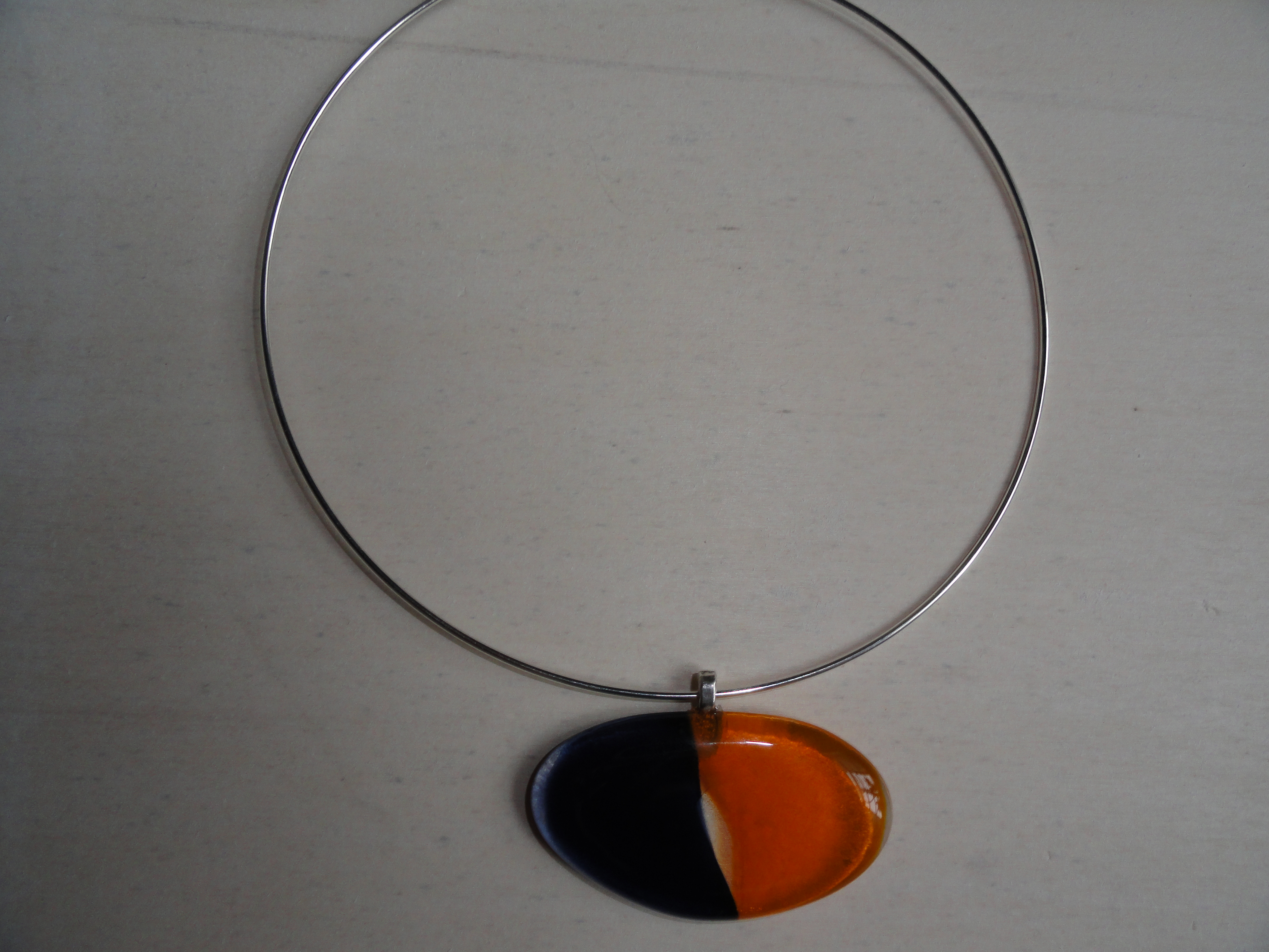 glassieraad aan een silver plated ketting van 43 cm blauw/oranje gefused