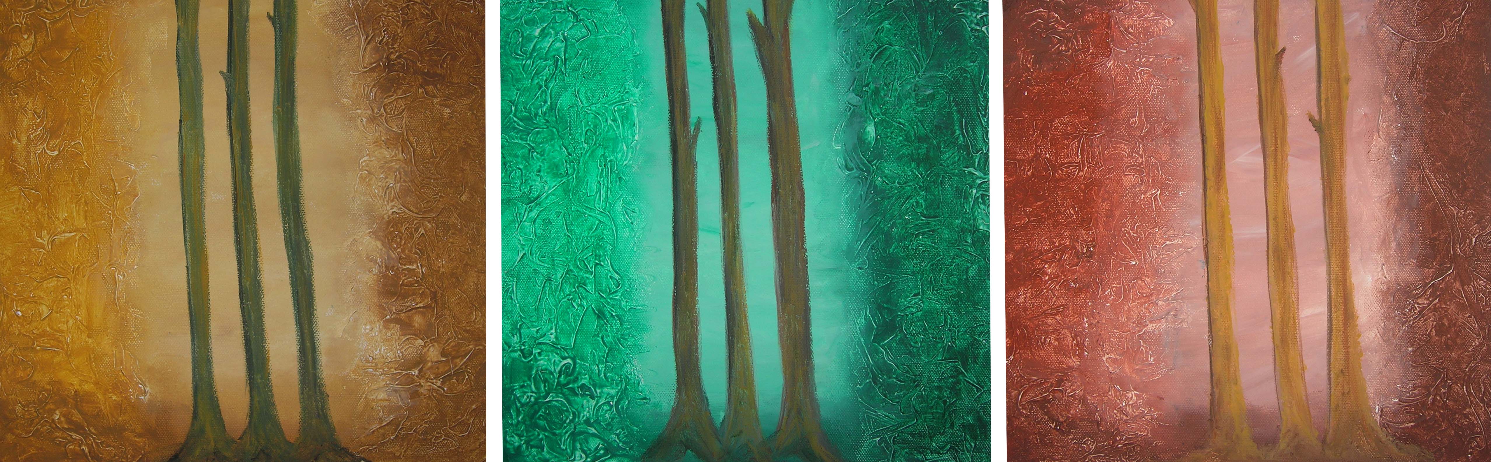 Geschilderd vanuit mijn gevoel. Bij de eerste aanzet op het doek is het een verrassing wat op het doek verschijnd. Drieluik 30x30